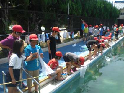 子どもたちは班ごとに網を持ち,友だちと協力し合いながらヤゴやアメンボなどを捕まえていきました。