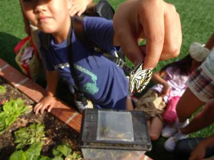 理科の学習で,観察していたアゲハチョウが大きくなりました。さなぎがだんだんと色が変わってくる様子を観察していた子どもたちは,今か今かと待ちわびていました。きれいな羽を広げて,飛びたそうにしているチョウを見て,