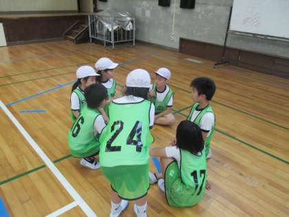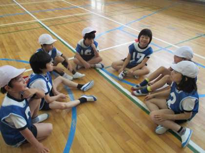 前半と後半の間には,それぞれのチームで作戦を立て,どうしたら相手チームより点が取れるかや,どうやったら守りやすいかを話し合っていました。