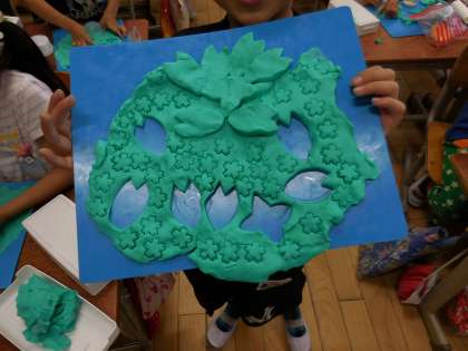 図画工作科の学習で,ねん土に型を押して模様をつけたり,ねん土から型を抜いて一つの作品にしていくといった活動を行いました。
