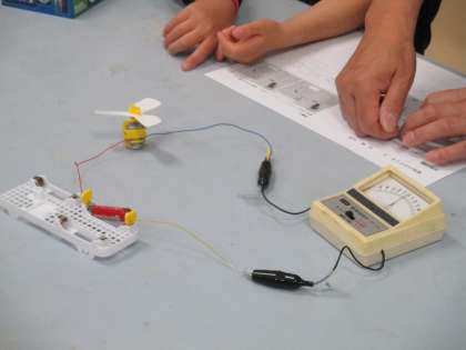 理科「電池のはたらき」の学習で,電池の向きを変えると電流の向きはどうなるか調べました。