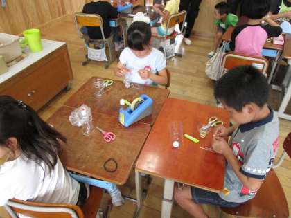3年生の授業の様子です。この時間,理科の”ゴムのはたらき”を利用したおもちゃを作りました。