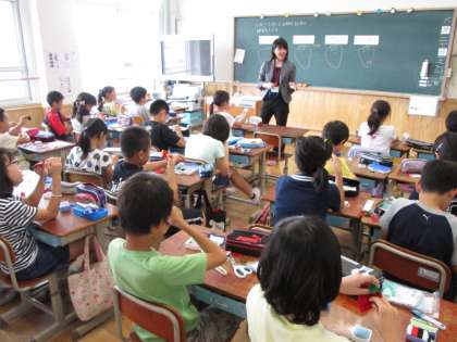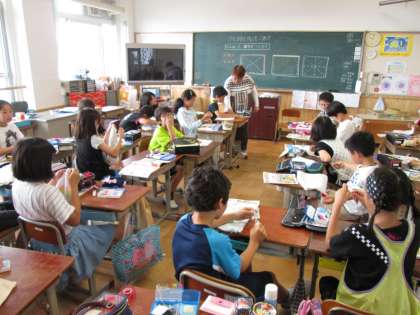 5年生の授業の様子です。この時間,家庭科の裁縫の学習をしました。保護者の方々にもアドバイスをいただきながら,一生懸命縫いました。