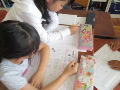 みさきの家で掲げる金閣小学校の旗のデザインを考えている様子です。