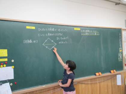 今日は,ひし形を対角線で切ったときにどのような形ができるのかを考える学習をしました。
