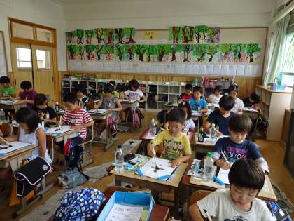 4月から毛筆の学習を始めた3年生ですが,随分準備も後片付けもスムーズにできるようになってきました。筆を持って字を書くのにも慣れてきました。