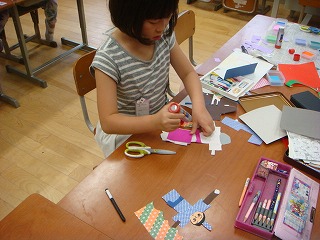 図工の時間に七夕かざりをつくりました。折り紙を切ったり貼ったり絵を描いたりして、すてきな飾りができました。短冊には一人ひとり、学校のことや将来のことなどの願いを書きました。