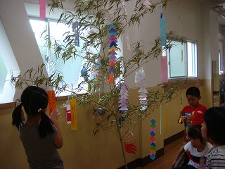 子どもたちは「きれいだね〜」「願いがかなうといいね〜」と言いながら、天井まで届く立派な笹を眺めていました。