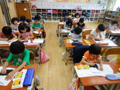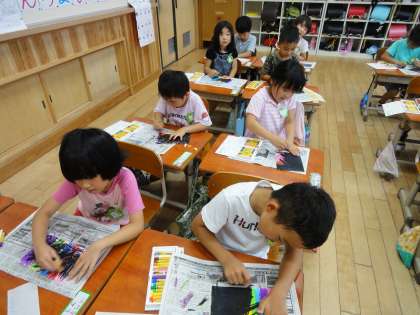図画工作科の学習で,カラフルカードを作りました。まずは,画用紙にを折ります。そして,パスで白いところが残らないように,上手に色をぬります。さらにその上から黒のパスで画用紙が真っ黒になるようにぬりかさねました。子どもたちはどんなカードになるのか,とてもわくわくしています。