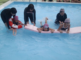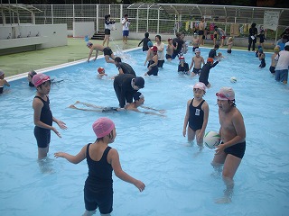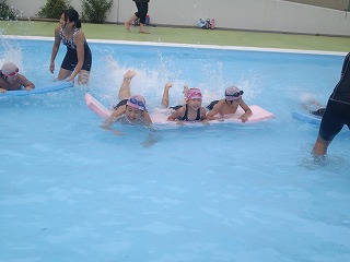 後半は、ロングビート板競争をしました。3〜4人で力を合わせて、上手にバタ足をしながら進んでいました。その後は、「かごめかごめ」をしたり、ボールを転がしたり,思い思いに過ごしていました。