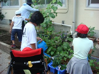 にじの子ガーデンで育てている野菜の苗もだいぶ大きくなりました。きゅうりはすでに5本ほど収穫しました。きゅうり以外にも、なすと枝豆があります。