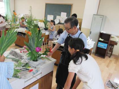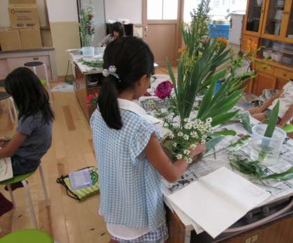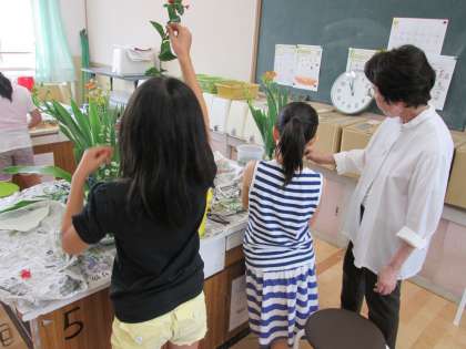前回同様に,まず生け花についてのお話を聞かせていただいた後に,実習に入りました。今回も,子どもたちは色とりどりの花を自分なりに考え,楽しく生けることができました。