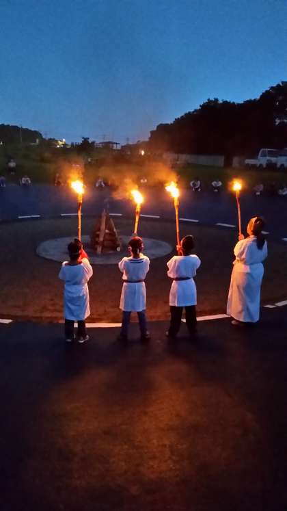 火の神様よりいただいた「自然の火」「協力の火」「自立の火」を大きく燃やし,みんなで大いに盛り上がっています。