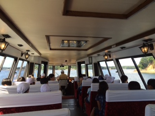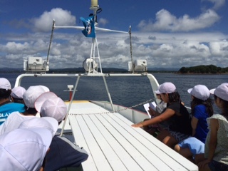 みさきの家から,船に乗って賢島に向かっています。2階の展望デッキにもあげていただいて,英虞湾の様子を眺めています。天気がいいので,海をわたる風がとても気持ちいいです。