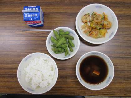今日の献立は,ごはん,みそ汁,夏野菜のかきあげ,えだ豆,牛乳でした。子どもたちも,食器が変わって,おいしい給食がさらにおいしく感じることでしょう。
