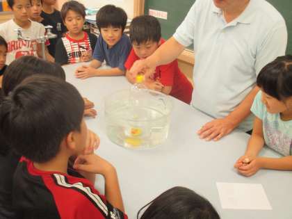 水面に浮かべたアヒルを,底を切ったペットボトルで沈めることができるかを実験し,空気にはかさがあることを確かめました。
