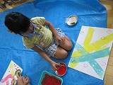 図工の時間に「スタンプ遊び」をしました。前時に画用紙にローラーで線をひき、その上にスタンプをしていきました。オクラやレンコン、トウモロコシなどの野菜やお菓子の型、段ボールなどを使って、自由に表現しました。いろんな色や形が重なって、すてきな作品が仕上がりました。