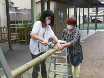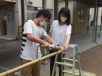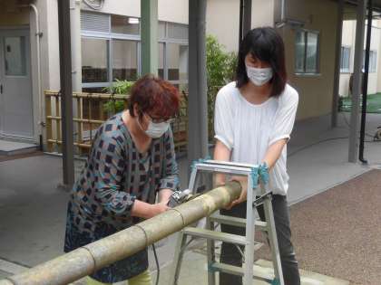 竹の粉がかかり,服を緑色にしながらの作業でした、
