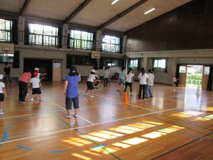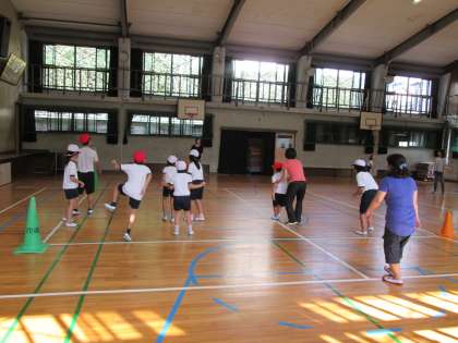 休憩の後は,ドッジビーをしました。ボールの代わりにフリスビーを使って行うもので,子どもたち対保護者の方々で試合をしました。にじの子の子どもたちは,積極的にフリスビーを取りに行く子,上手によける子,様々でしたが,みんなで楽しく試合をすることができました。