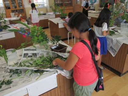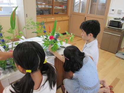前回同様に,まず生け花についてのお話を聞かせていただいた後に,実習に入りました。毎回,様々な種類のお花を用意していただいています。そのお花をどのように生けようかと,子どもたちは自分なりに構図を考え,おもいおもいの作品に仕上げていきました。