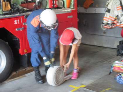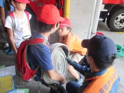 消防車の中に積まれている道具を見せていただいたり,ホースを実際に持たせていただいたりしました。