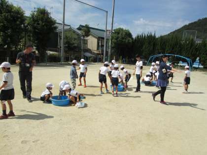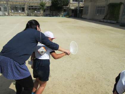 とてもいい天気だった昨日,1年生が運動場でシャボン玉作りをしました。金魚すくいのポイやうちわのほね組みなどの小さいものから,ハンガーを変形させて作った大きな輪など,様々な道具を使ってシャボン玉作りを楽しみました。