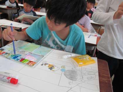 子どもたちが一生懸命描いた下描きに着色していきました。