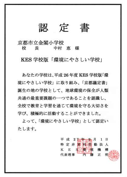 昨年度の本校の取組が、NPO法人 KES環境機構から「環境にやさしい学校」として認定され,先日,認定証をいただきました。衣笠山でのフィールドワークや校舎改修に合わせての環境学習等を評価していただきました。これからもスーパーエコスクールとして新しくなった金閣小学校で,環境教育の充実に向けて取組を進めていきたいと考えています。