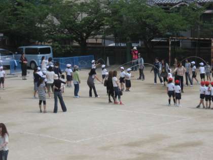 夏を思わせる青空の下,2年生の親睦会が行われました。学級委員の保護者の方を中心に計画していただき,2年生の子どもたちと保護者との楽しい時間を過ごすことができました。子どもたちもおうちの方たちにかっこいいところを見せようと,張り切って大縄を跳んでいました。