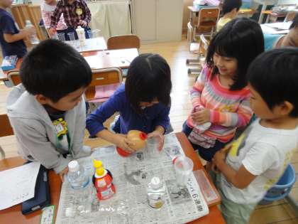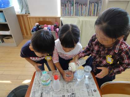 算数科の学習では,「かさくらべ」をしました。まずは,みんなでコップを使ったかさの比べ方を考え,やってみました。学んだことを活かして,自分たちで持ちよった容器を使って,グループで協力してかさくらべをし,記録にも挑戦しました。水をこぼしてしまうと,結果が変わるので,苦戦しながらも上手にかさくらべを行うことができました。