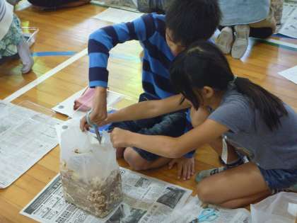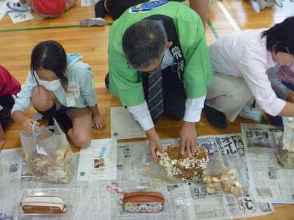 お話を聞いた後は,いよいよシイタケ栽培の体験です。今回子どもたちは,菌床栽培でシイタケを育てます。木に菌をうつ原木栽培では,シイタケが育つまで1年ほどかかるのですが,菌床栽培だと1〜2週間で育つそうです。