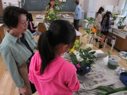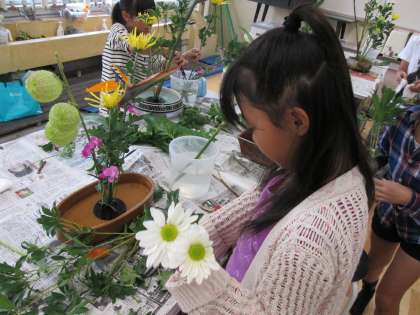 前回同様に,まず生け花についてのお話を聞かせていただいた後に,実習に入りました。今回も,花に特徴のある「ストレチヤ」や風船を連想させる「ふうせんとうわた」など様々な花材を用意していただきました。子どもたちは毎回,どんなお花を使って生けるのか楽しみにしています。今日もどのお花をどのように生けようかと,自分なりに構図を考え,楽しく作品を作っていました。
