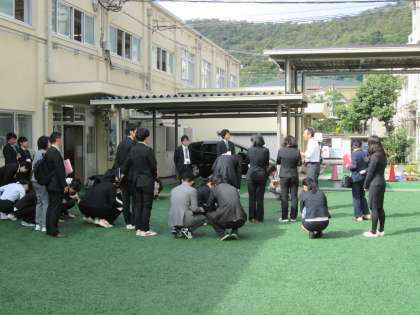朝から,京都教育大学より学生を中心にたくさんの方が来校されました。本校の,スーパーエコスクール実証事業と環境教育の様子を見学に来られました。