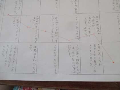 はじめに,物語全体を通しての登場人物の気持ちをまとめました。その後関係がどう変わっていったかを折れ線グラフのような形で表現しました。