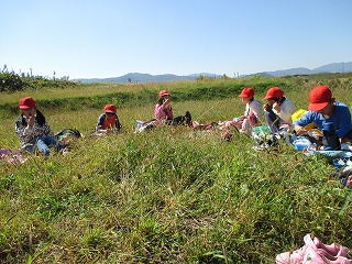 お昼は、川べりでみんなで仲良くお弁当をいただきました。雲一つないすっきりとした青空で、絶好の遠足日和でした。早く食べ終わった子どもは鬼ごっこをしたり、バッタを見つけたり、自然の中で思いっきり過ごしていました。