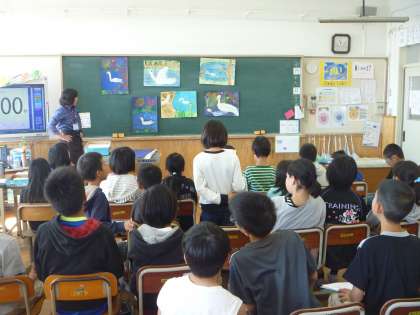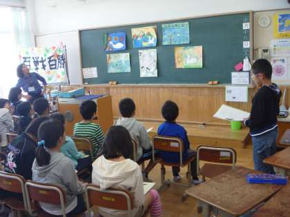 図画工作の時間にがんばってかいてきたお話の絵が完成し,今日はその鑑賞会をしました。子どもたちは,一人一人,自分が工夫したところやがんばったところを発表しました。