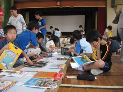今日(6月4日),選書会を行いました。本屋さんに協力していただき,講堂に真新しいたくさんの本を並べてもらいました。子どもたちが「この本,おもしろそうやなぁ…」と学校の図書室に入れる本を品定めです。