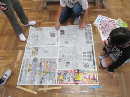 まず,1平方メートルの新聞紙を作成するために教室中のものを使ってグループで協力して作りました。