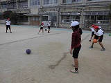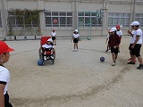 体育では、ころがしドッジボールをしています。はじめに二人組でボールを転がす練習をした後、二つのチームに分かれて試合をしました。ボールを転がす方も逃げる方も必死になって動き回っていました。