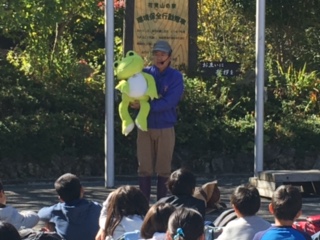 山の家の所員の先生から,説明を聞いています。山の家の先生が手に持っておられるカエルの人形は,「花コロ」という花背山の家のマスコットキャラクターです。花背に住んでいて,夜になったら「コロコロ」という美しい声で鳴くことから,「花コロ」という名前がついたのだそうです。