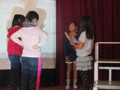 講堂で練習し,自分たちの様子がどのようなものかをビデオで撮り.伝わりやすい話し方ができているか確かめました。