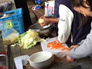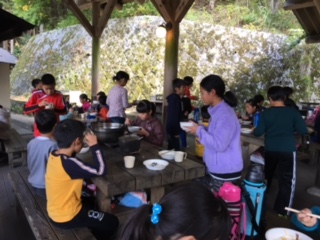今日の昼食は野外炊事です。メニューは,「焼きそば」,「シチュー」,「牛すき焼き風」,「豚汁」です。みんなで作って,好きなものを食べる,バイキング形式の野外炊事。いろんな種類のものが食べられて,みんな大満足です。
