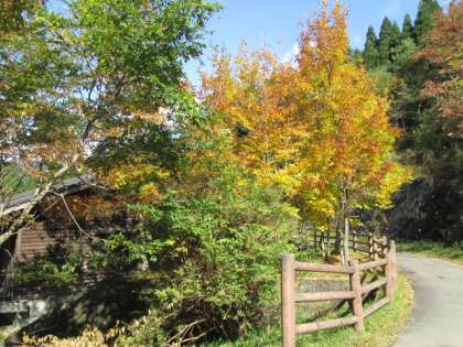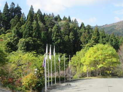 花背山の家では、もうすっかり紅葉が始まっていて、青空と、赤や黄色に色づいた木々のコントラストがとても美しいです。子どもたちも、花背の自然を満喫しています。