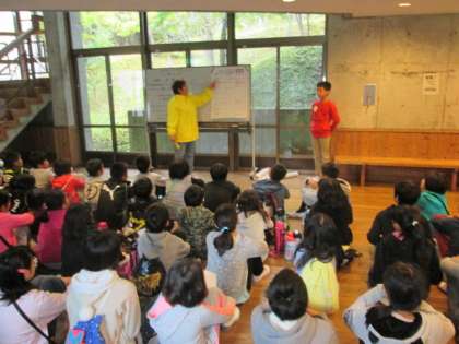 今日も朝からいい天気です。朝のつどいは宿泊棟のミーティングスペースで行いました。子どもたちが早く集まってこれたので、定刻より10分も早く、朝のつどいを始めることができました。