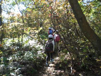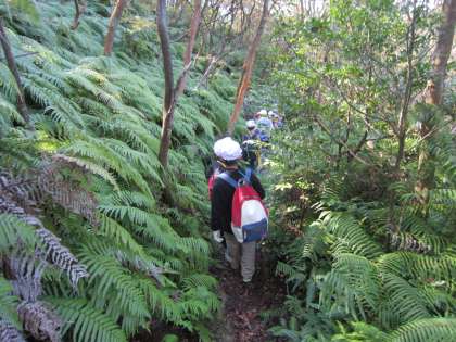 標高201mの低い衣笠山ですが,急な坂道があったり,狭い道もあったりしました。また,それぞれの場所に育つ植物にも特徴があり,針葉樹がたくさん育つ場所,ウラジロがたくさん育つ場所などありました。