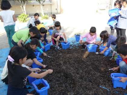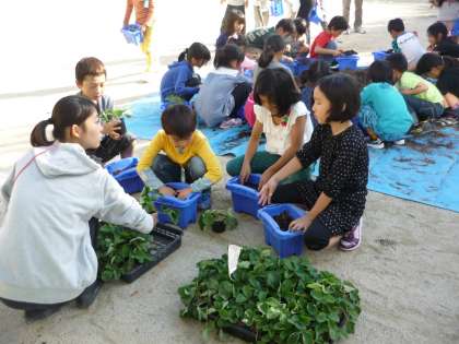 イチゴの苗をそーっと持って,優しく土の中に入れたら,ふんわりと土のお布団をかけてあげて,できあがり!