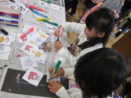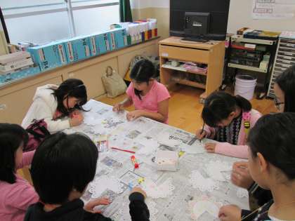 理科室では,クリスマスグッズ作りをしました。子どもたちは色鉛筆等で色をつけたり絵をかいたりして,おもいおもいの飾りを作りました。また,家庭科室はプラバンコーナーでした。あらかじめ用意していただいたプラスチックの板に絵を描いたり写したりした後,係の保護者の方にオーブントースターで加熱してもらいました。とてもお気に入りの作品ができたようです。