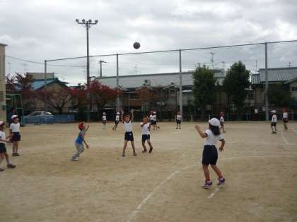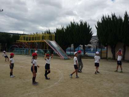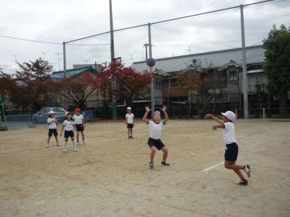 体育でパスゲームをしました。両手でしっかりボールをキャッチして投げる練習をした後,試合をしました。先週はボールけりゲームをしていたので,ついついボールを蹴ろうとしてしまう姿も見られましたが・・・。