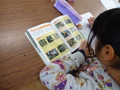 森林教室の時は,鳴き声だけしか聞こえなくて実際見られなかった『シジュウカラ』が,図鑑で調べてどんな鳥だったのか分かったり,いろいろなドングリの名前を知ることができたりして,さらにくわしく生きものについて知ることができました。