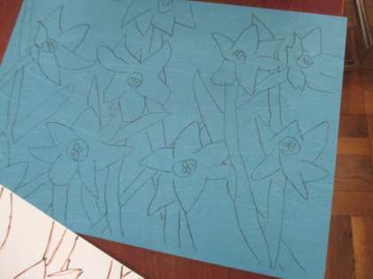 まず下書きを油性ペンでなぞり,カーボン紙を使って板に写しとりました。